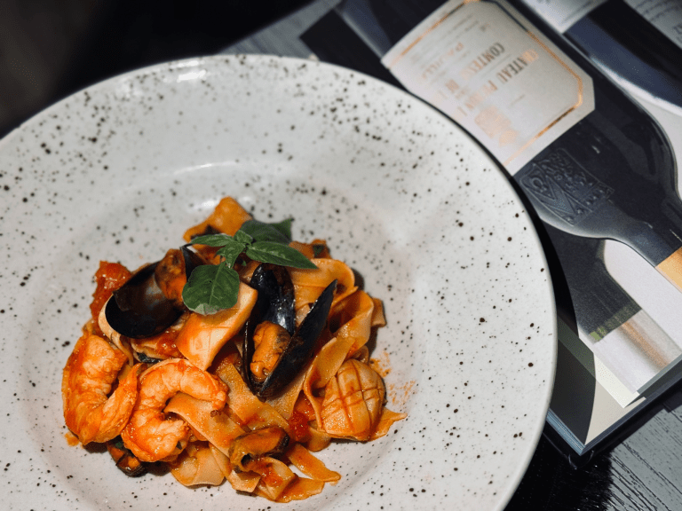 Мікс морепродуктів протушкованих у вині та вершковому маслі подаються з спагетті