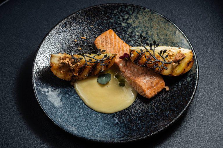 Ароматні шматочки лосося подаються з карамелізованою грушею та соусом “винний бешамель”