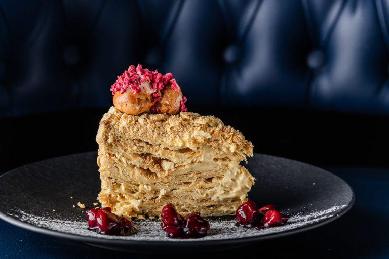Заварний крем зі збитими вершками, хрустке тісто, профітроль із вершковим кремом і вишневе компоте. Ідеальне поєднання ніжності та текстури.