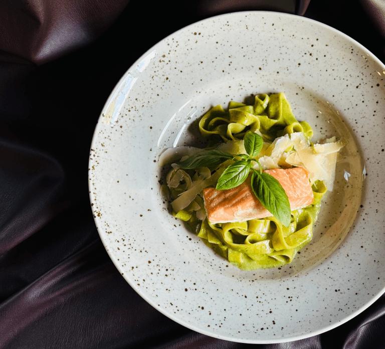 Ніжні шматочки філе лосося приготовлені у вершках та соусі песто