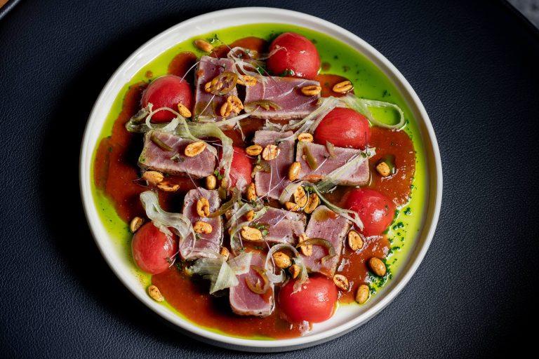Шматочки злегка підсмаженого тунця в зеленому маслі та соусі Понзу з помідорами конкасе, перцем халапеня та арахісом чилі