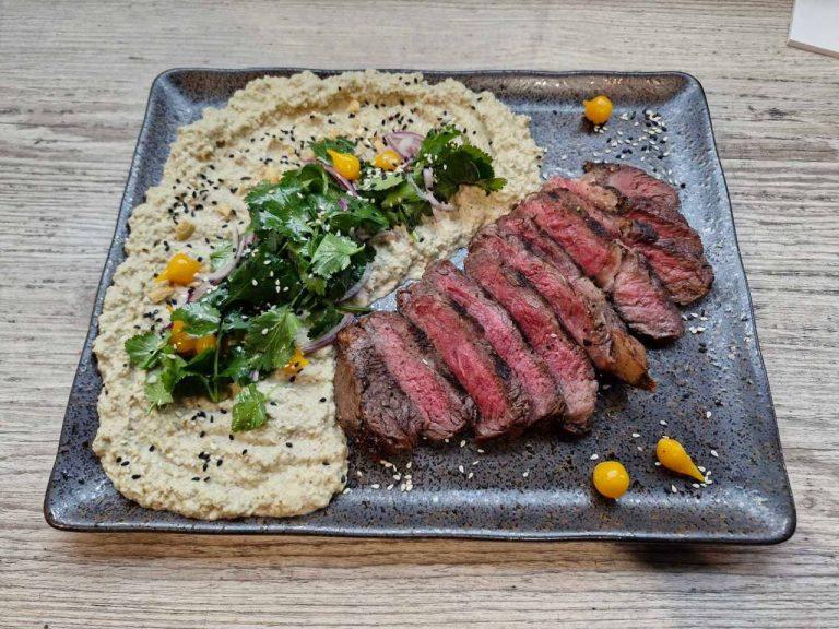 Стейк Рібай із пюре з запеченого баклажану та горіхами
