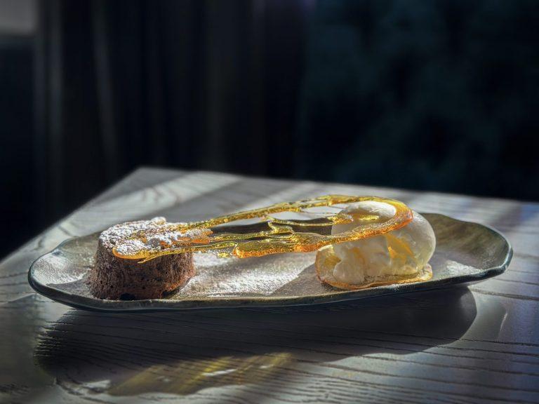 Французький десерт, головна особливість якого — рідка серединка із шматочком сиру Дор блю, оповита повітряним м’якушем із хрусткою скоринкою, подається з кулькою морозива