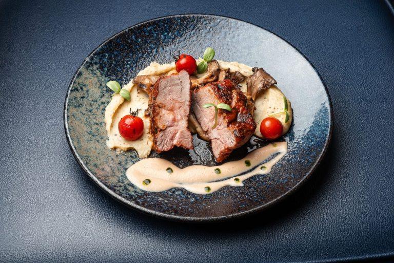 Соковитий стейк зі свинини подаємо із картопляно-трюфельним пюре, гливами та соусом на вершковій основі