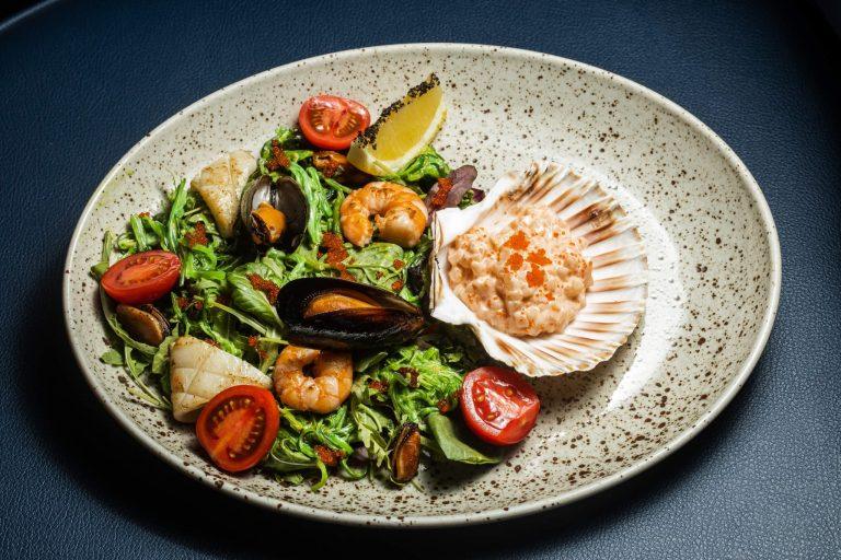Теплий салат з морепродуктами та тартаром з гребінця