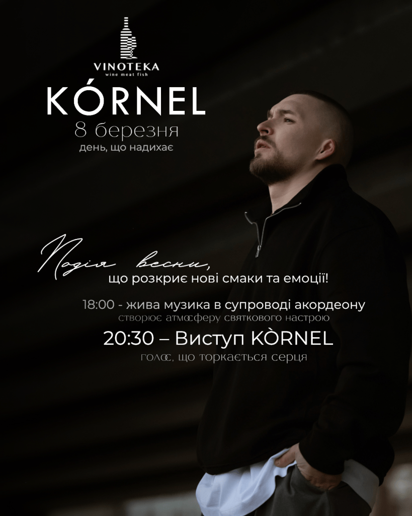 20:30 – виступ KÒRNEL, голос, що торкається серця та дарує незабутні емоції.